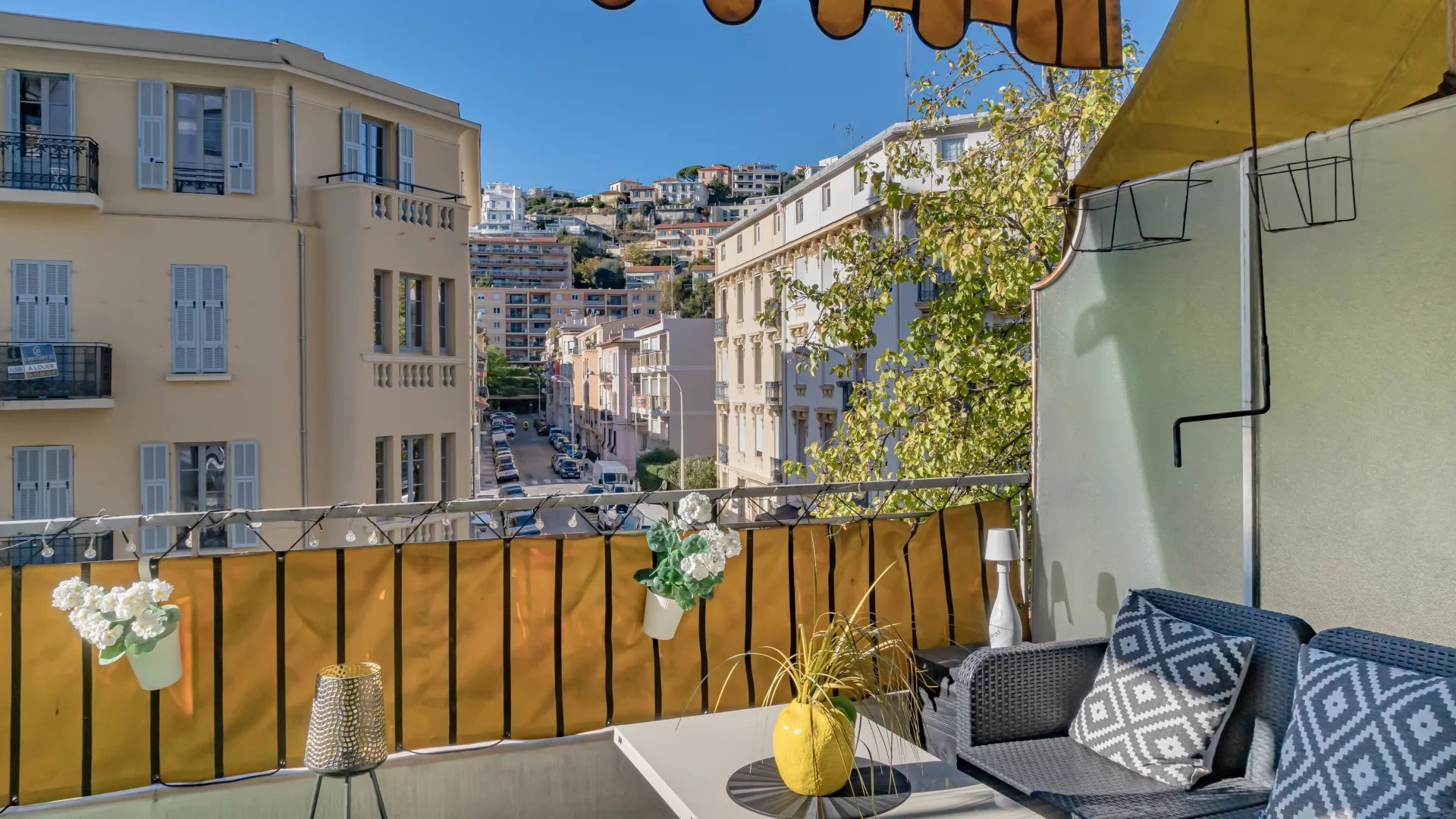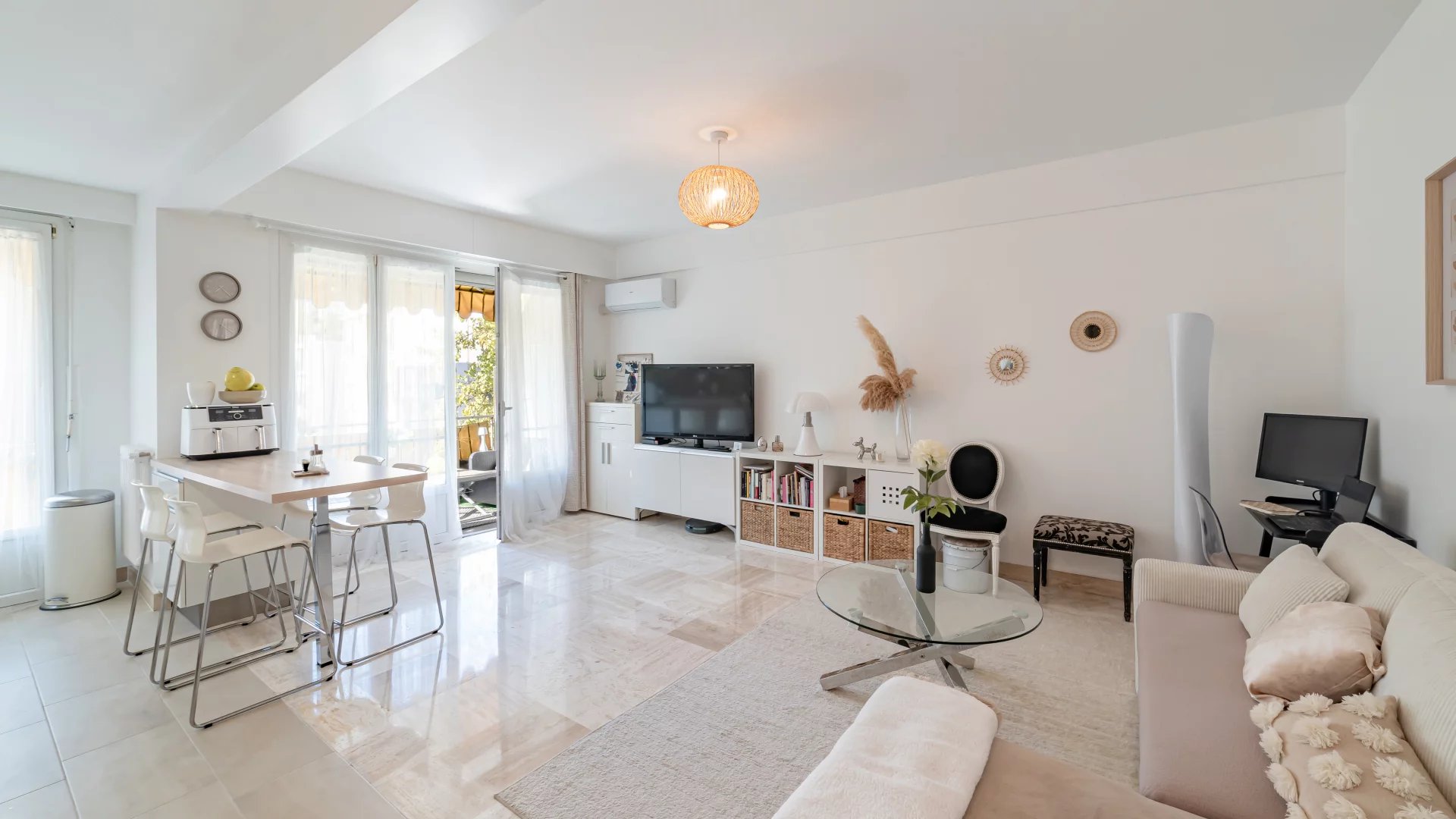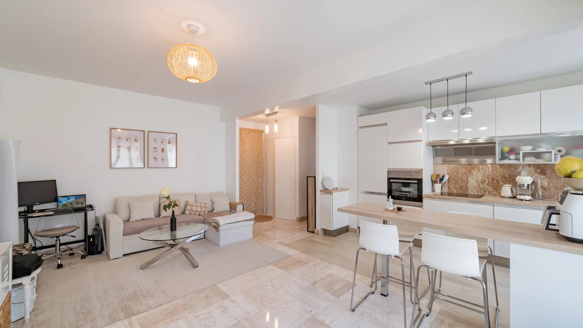 The open-plan kitchen extends into the living room, which opens onto a pleasant 9 m² terrace.